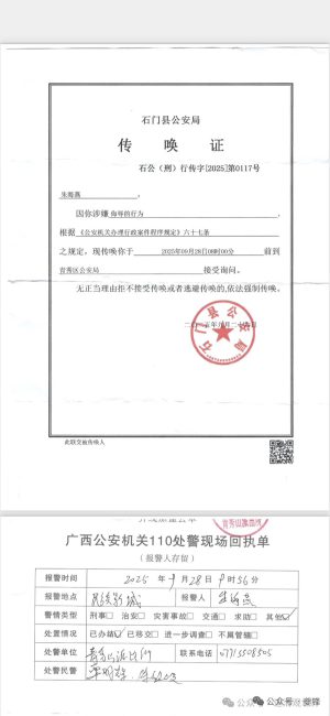 这起事件的荒诞性与争议性,集中体现在行为定性与程序上。根据当事人朱海燕的陈述及公开信息,2025 年 9 月 28 日,八名来自石门县的警员(三名着警服、五名便衣)跨越 1000 公里抵达南宁,向其送达《传唤证》,理由是“因你涉嫌侮辱的行为”。而所谓 “违法事实”,仅仅是她此前在一个微信群中拉了一名网友入群,该网友后续又拉入第三人,第三人在群内转发了一篇涉及石门县纪委副书记吴昌军的文章。