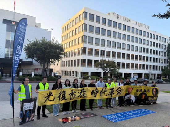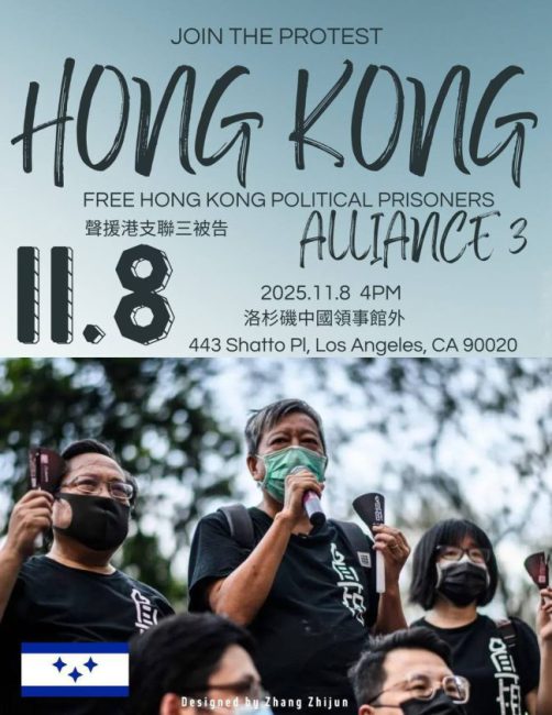 在2025年11月8日洛杉矶中国领事馆举行的中国民主党全国委员会第763次茉莉花行动集会中,中国民主党党员呼吁国际社会持续关注香港支联会三位核心成员——李卓人、何俊仁与邹幸彤——遭长期羁押的情况,并要求中共与香港当局立即、无条件释放三人。
